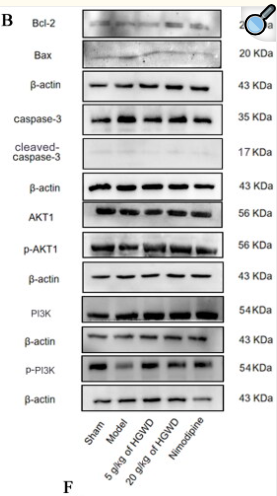 Figure 8. HGWD alleviated apoptosis after cerebral I/R. (A) TUNEL staining images of five groups. (Scale bar = 50 μm, 400×). (B) HGWD reduced cell apoptosis through PI3K/AKT signalling pathway. Western blotting was utilized to examine the levels of Bcl-2, Bax, caspase-3, cleaved caspase-3, AKT1, p-AKT1, PI3K, and p-PI3K. (C) Percentages of TUNEL positive cells were utilized to evaluate the differences in the five groups. Integrated density data were quantified (D-J). the results (D-H), respectively, showed the levels of Bax, Bcl-2, the ratio of Bcl-2/Bax, caspase-3, and cleaved caspase-3 in the brains of rats for five groups, with β-actin as the internal control. The results of I and J, respectively, showed the ratios of p-AKT1/AKT1 and p-PI3K/PI3K in the brains of rats for five groups. All data were shown as mean ± SD. (n = 3, *p ...