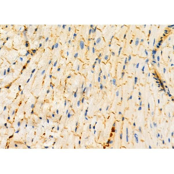 ab13806 at 1/100 staining Mouse heart tissue by IHC-P. The sample was formaldehyde fixed and a heat mediated antigen retrieval step in citrate buffer was performed. The sample was then blocked and incubated with the primary antibody at 4°C overnight. An HRP conjugated anti-Rabbit antibody was used as the secondary antibody....