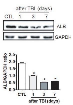 FIGURE 1 | Irradiation-induced liver damage in mice. C57BL/6J mice were exposed to 8.0 Gy of total body irradiation (TBI). Liver tissues were harvested at days 1, 3, and 7 post-exposure (n = 6). (A) Representative pictures by HE staining are shown. Scale bar = 50 μm. Arrows indicate edema hepatocytes. (B and C) ALB and AFP expression in liver tissues (n = 3). Expression of ALB (B) and AFP (C) was detected by western blotting....