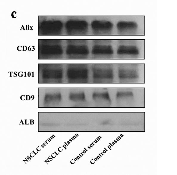 Figure 1. Characterisation of EVs derived from the serum and plasma of NSCLC patients and controls. (a) The shape and structure of serum and plasma EVs isolated by EXOquick kit under TEM. The red arrow represents EVs with typical characteristics (scale bars are 200 nm). (b) The size of EVs derived from control groups and NSCLC groups was analysed by NTA. (c) Western blots of EVs membrane markers, including Alix, CD63, TSG101, CD9, and one negative marker ALB....