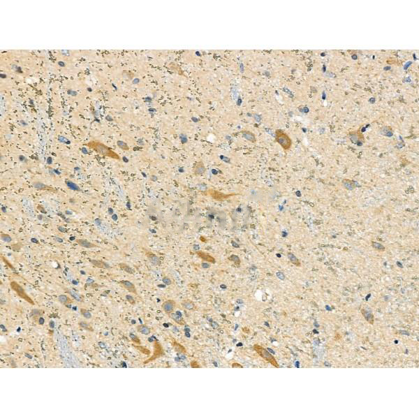 ab15279 at 1/100 staining Rat brain tissue by IHC-P. The sample was formaldehyde fixed and a heat mediated antigen retrieval step in citrate buffer was performed. The sample was then blocked and incubated with the primary antibody at 4°C overnight. An HRP conjugated anti-Rabbit antibody was used as the secondary antibody....