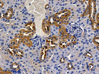 ab14614 at 1/100 staining mouse kidney tissue by IHC-P. The sample was formaldehyde fixed and a heat mediated antigen retrieval step in citrate buffer was performed. The sample was then blocked and incubated with the primary antibody at 4°C overnight. An HRP conjugated anti-rabbit antibody was used as the secondary antibody....