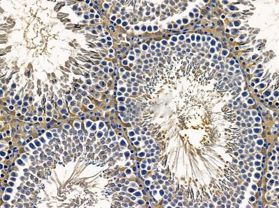 ab14614 at 1/100 staining rat testis tissue by IHC-P. The sample was formaldehyde fixed and a heat mediated antigen retrieval step in citrate buffer was performed. The sample was then blocked and incubated with the primary antibody at 4°C overnight. An HRP conjugated anti-rabbit antibody was used as the secondary antibody....
