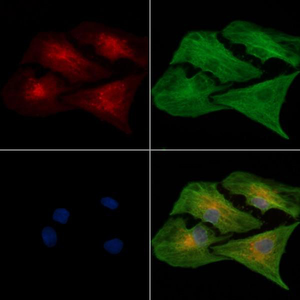 ab14614 staining A549 cells by IF/ICC. The samples were fixed with PFA and permeabilized in 0.1% Triton X-100,then blocked in 10% serum for 45 minutes at 25°C. Samples were then incubated with primary Ab(ab14614) and mouse anti-beta tubulin Ab for 1 hour at 37°C. An AlexaFluor594 conjugated goat anti-rabbit IgG(H+L) Ab(Red) and an AlexaFluor488 conjugated goat anti-mouse IgG(H+L) Ab(Green) were used as the secondary antibody. The nuclear counter stain is DAPI (blue)....