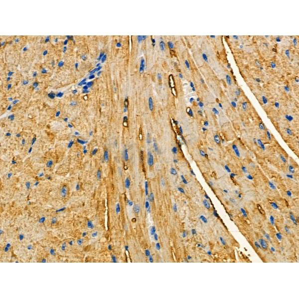 ab13934 at 1/100 staining Rat heart tissue by IHC-P. The sample was formaldehyde fixed and a heat mediated antigen retrieval step in citrate buffer was performed. The sample was then blocked and incubated with the primary antibody at 4°C overnight. An HRP conjugated anti-Rabbit antibody was used as the secondary antibody....