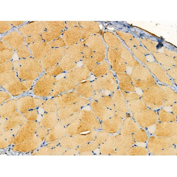 ab13934 at 1/100 staining Mouse muscle tissue by IHC-P. The sample was formaldehyde fixed and a heat mediated antigen retrieval step in citrate buffer was performed. The sample was then blocked and incubated with the primary antibody at 4°C overnight. An HRP conjugated anti-Rabbit antibody was used as the secondary antibody....