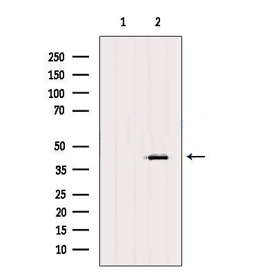 Western blot analysis of extracts from Mouse kidney, using ALDOB Antibody. The lane on the left was treated with blocking peptide....