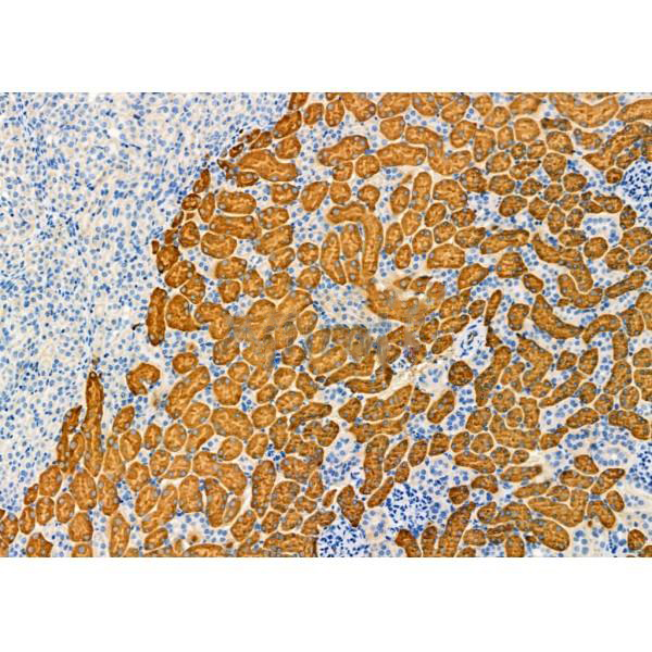 ab14922 at 1/100 staining Mouse kidney tissue by IHC-P. The sample was formaldehyde fixed and a heat mediated antigen retrieval step in citrate buffer was performed. The sample was then blocked and incubated with the primary antibody at 4°C overnight. An HRP conjugated anti-Rabbit antibody was used as the secondary antibody....
