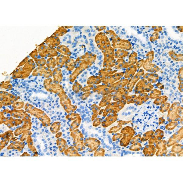 ab14922 at 1/100 staining Rat kidney tissue by IHC-P. The sample was formaldehyde fixed and a heat mediated antigen retrieval step in citrate buffer was performed. The sample was then blocked and incubated with the primary antibody at 4°C overnight. An HRP conjugated anti-Rabbit antibody was used as the secondary antibody....
