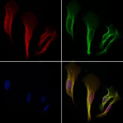 ab14922 staining Hela cells by IF/ICC. The samples were fixed with PFA and permeabilized in 0.1% Triton X-100,then blocked in 10% serum for 45 minutes at 25°C. Samples were then incubated with primary Ab(ab14922 1:200) and mouse anti-beta tubulin Ab for 1 hour at 37°C. An AlexaFluor594 conjugated goat anti-rabbit IgG(H+L) Ab(Red) and an AlexaFluor488 conjugated goat anti-mouse IgG(H+L) Ab(Green) were used as the secondary antibody. The nuclear counter stain is DAPI(blue)....