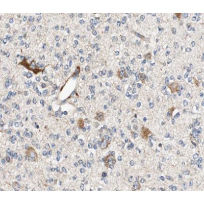 ab10497 at 1/100 staining human brain tissue sections by IHC-P. The tissue was formaldehyde fixed and a heat mediated antigen retrieval step in citrate buffer was performed. The tissue was then blocked and incubated with the antibody for 1.5 hours at 22°C. An HRP conjugated goat anti-rabbit antibody was used as the secondary antibody....
