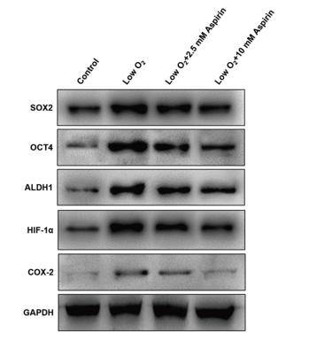 Fig. 2.| Aspirin inhibits the hypoxia-enhanced stemness of A549 cells. (A–C) mRNA levels of SOX-2, OCT4, and ALDH1 were determined by qRT–PCR using specific primers, with GAPDH serving as the internal control. (D, E) mRNA levels of HIF-1α and COX-2 were determined by qRT–PCR using specific primers, with GAPDH serving as the internal control. (F) The concentration of PGE2 secreted by A549 cells was determined by ELISA. Each bar indicates the mean ± SD of n = 3 experiments. * indicates P < 0.05, ** indicates P < 0.01. (G) SOX-2, OCT4, ALDH1, HIF-1α, and COX-2 protein levels were determined by Western blot, with GAPDH serving as the loading control....