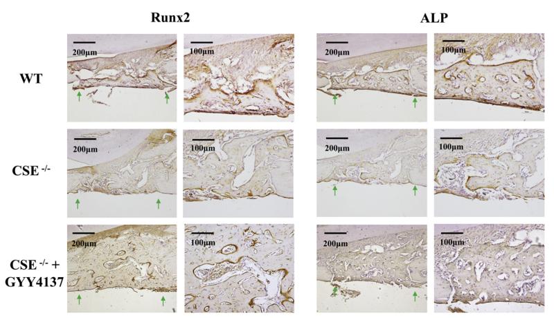 Fig. 4. Immunohistochemistry stainings of RUNX2 and ALP in the mandibular defect area of WT, CSE−/−and CSE−/− + GYY4137 mice 2 weeks after surgery. WT and CSE−/− + GYY4137 mice demonstrated increased expression levels of RUNX2 and ALP in the defect area 2 weeks after surgery. Green arrows represent the margin of the mandibular defect area. WT: wild type; CSE-/-: CSE knock out mice; Runx2: runt-related transcription factor 2; ALP: alkaline phosphatase. (For interpretation of the references to colour in this figure legend, the reader is referred to the web version of this article)....