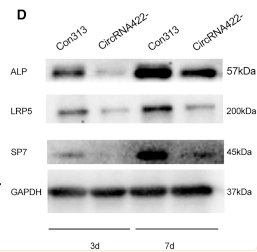 Figure 3 circRNA422 interfering inhibited osteogenic differentiation of BMSCs (A) ALP staining to evaluate the effect of circRNA422− on the ALP activity of BMSCs on osteogenic days 3 and 7. (B) Protein levels of OCN to evaluate the effect of circRNA422− on mineralization of BMSCs on osteogenic days 14 and 21. (C) Quantitative real-time PCR analysis showed that the osteogenic mRNA expressions levels of SP7, LRP5, ALP, OCN, BSP, and OPN were downregulated by circRNA422− compared with Con313 on osteogenic days 3 and 7 (n = 3, ∗p < 0.05). (D) WB analysis showed that the osteogenic protein expressions levels of ALP, LRP5, and SP7 were reduced by circRNA422− compared with Con313 on osteogenic days 3 and 7 (n = 3, ∗p < 0.05)....