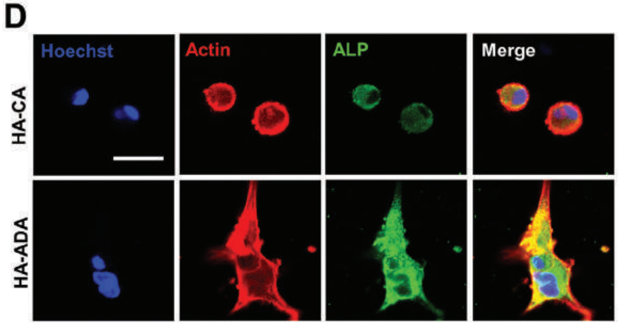 Figure 7. The dynamic HA-ADA hydrogel enhances the osteogenic differentiation. D) Representative images and E) quantified intensity (n = 20) of ALP (green) immunostaining of the hMSCs in the hydrogels....