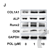 Figure 1. POL stimulated BMSCs proliferation and osteogenic differentiation. (A) POL chemical structure; (B) BMSCs surface markers were detected by flow cytometry; (C) The result of CCK-8 assay (n = 5); (D-E) The result of CFU assay (n = 5); (F) Images of ALP staining (scale bar = 250 μm); (G) Quantification of ALP staining (n = 5); (H) Images of ARS staining (scale bar = 250 μm); (I) Quantification of ARS staining (n = 5); (J-K) The protein expression levels of OCN, RUNX2, ALP, and COL1A1 were evaluated by western blot (n = 3); (L-M) Immunofluorescence staining of OCN and ALP (scale bar = 200 μm). Data were presented as mean ± SEM. Compared with control group: * P < 0.05, **P < 0.01, ***P < 0.001. Compared with 1 μM group: # P < 0.05, ##P < 0.01, ###P < 0.001....