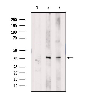 Western blot analysis of extracts from various samples, using ALKBH5 Antibody. Lane 1: Mouse heart, treated with blocking peptide; Lane 2: Mouse heart; Lane 3: Rat muscle. Observed bands: 37 kDa....