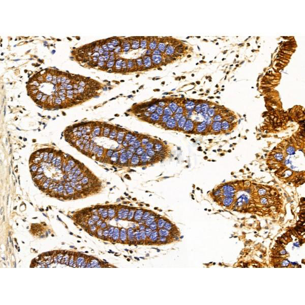 ab11129 at 1/100 staining Rat colorectal tissue by IHC-P. The sample was formaldehyde fixed and a heat mediated antigen retrieval step in citrate buffer was performed. The sample was then blocked and incubated with the primary antibody at 4°C overnight. An HRP conjugated anti-Rabbit antibody was used as the secondary antibody....