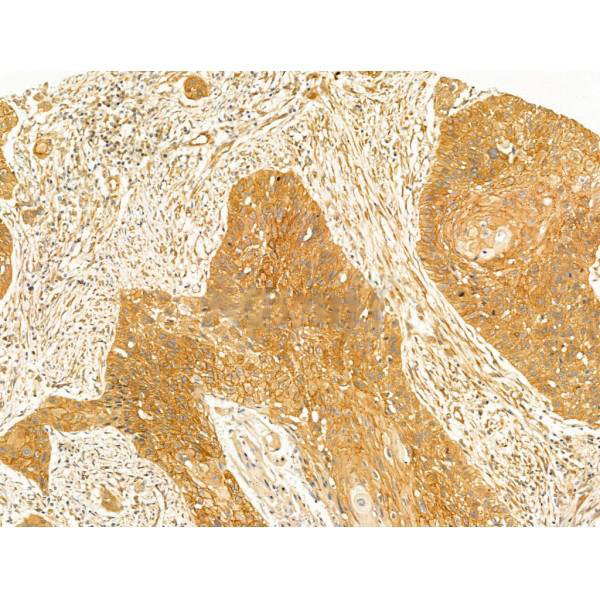 ab11129 at 1/100 staining Human esophageal cancer by IHC-P. The sample was formaldehyde fixed and a heat mediated antigen retrieval step in citrate buffer was performed. The sample was then blocked and incubated with the primary antibody at 4°C overnight. An HRP conjugated anti-Rabbit antibody was used as the secondary antibody....