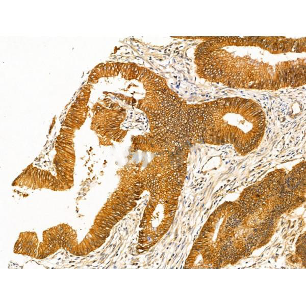 ab11129 at 1/100 staining Human colorectal cancer by IHC-P. The sample was formaldehyde fixed and a heat mediated antigen retrieval step in citrate buffer was performed. The sample was then blocked and incubated with the primary antibody at 4°C overnight. An HRP conjugated anti-Rabbit antibody was used as the secondary antibody....