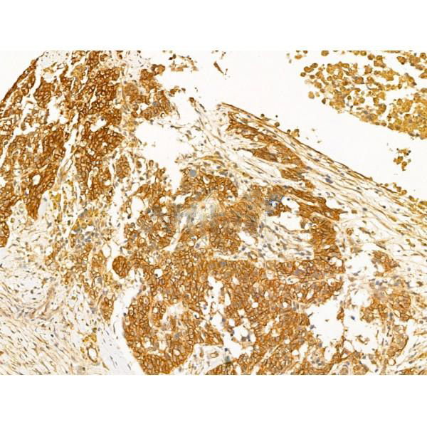 ab11129 at 1/100 staining Human ovarian cancer by IHC-P. The sample was formaldehyde fixed and a heat mediated antigen retrieval step in citrate buffer was performed. The sample was then blocked and incubated with the primary antibody at 4°C overnight. An HRP conjugated anti-Rabbit antibody was used as the secondary antibody....
