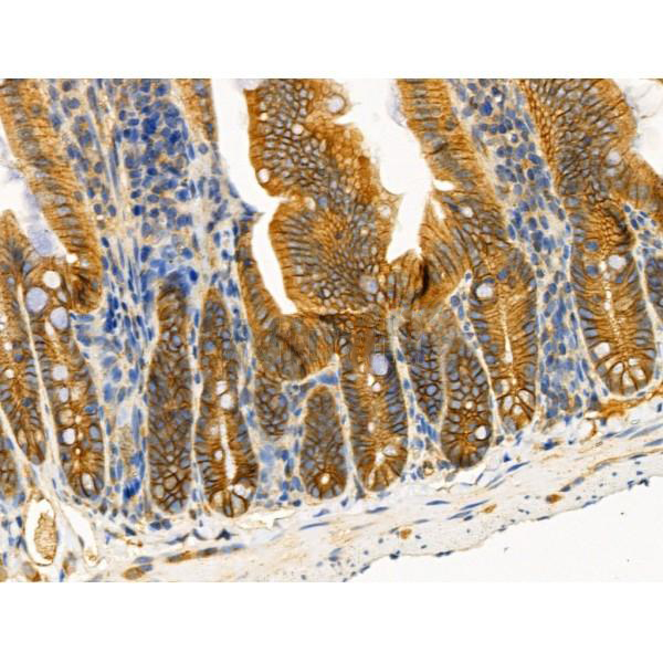 ab11129 at 1/100 staining Mouse colorectal tissue by IHC-P. The sample was formaldehyde fixed and a heat mediated antigen retrieval step in citrate buffer was performed. The sample was then blocked and incubated with the primary antibody at 4°C overnight. An HRP conjugated anti-Rabbit antibody was used as the secondary antibody....