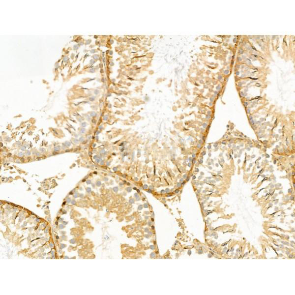 ab11129 at 1/100 staining Rat testis tissue by IHC-P. The sample was formaldehyde fixed and a heat mediated antigen retrieval step in citrate buffer was performed. The sample was then blocked and incubated with the primary antibody at 4°C overnight. An HRP conjugated anti-Rabbit antibody was used as the secondary antibody....