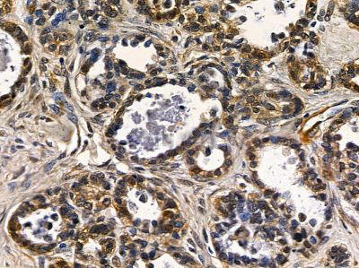 ab14635 at 1/100 staining human ovarian cancer by IHC-P. The sample was formaldehyde fixed and a heat mediated antigen retrieval step in citrate buffer was performed. The sample was then blocked and incubated with the primary antibody at 4°C overnight. An HRP conjugated anti-rabbit antibody was used as the secondary antibody....