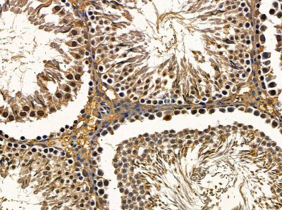 ab14635 at 1/100 staining rat testis tissue by IHC-P. The sample was formaldehyde fixed and a heat mediated antigen retrieval step in citrate buffer was performed. The sample was then blocked and incubated with the primary antibody at 4°C overnight. An HRP conjugated anti-rabbit antibody was used as the secondary antibody....