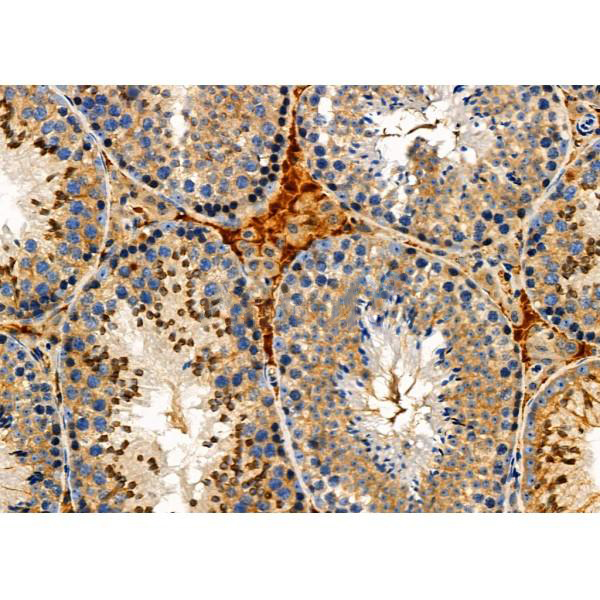 ab16713 at 1/100 staining Mouse testis tissue by IHC-P. The sample was formaldehyde fixed and a heat mediated antigen retrieval step in citrate buffer was performed. The sample was then blocked and incubated with the primary antibody at 4°C overnight. An HRP conjugated anti-Rabbit antibody was used as the secondary antibody....