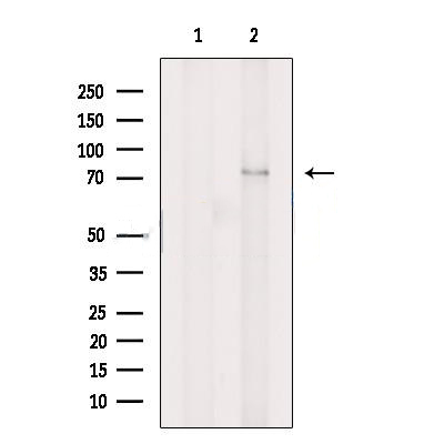 Western blot analysis of extracts from VERO cells, using AMFR Antibody. The lane on the left was treated with blocking peptide....