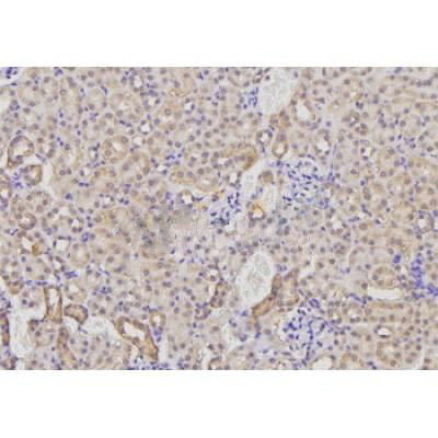 ab17621 at 1/100 staining Rat kidney tissue by IHC-P. The sample was formaldehyde fixed and a heat mediated antigen retrieval step in citrate buffer was performed. The sample was then blocked and incubated with the antibody for 1.5 hours at 22°C. An HRP conjugated goat anti-rabbit antibody was used as the secondary antibody....