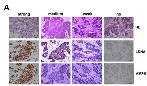 Fig. 2. The expression of LDHA and AMPK showed a positive correlation in breast cancer. A. The expression of LDHA and AMPK were detected by IHC using breast cancer TMAs of 112 patients. Representative IHC images of four staining degrees (no-weak-medium-strong) of LDHA and AMPK expression under a microscope were showed (400). B. The correlation between LDHA and AMPK expression scores of 112 breast cancer patients was analyzed and a positive correlation between them was showed....