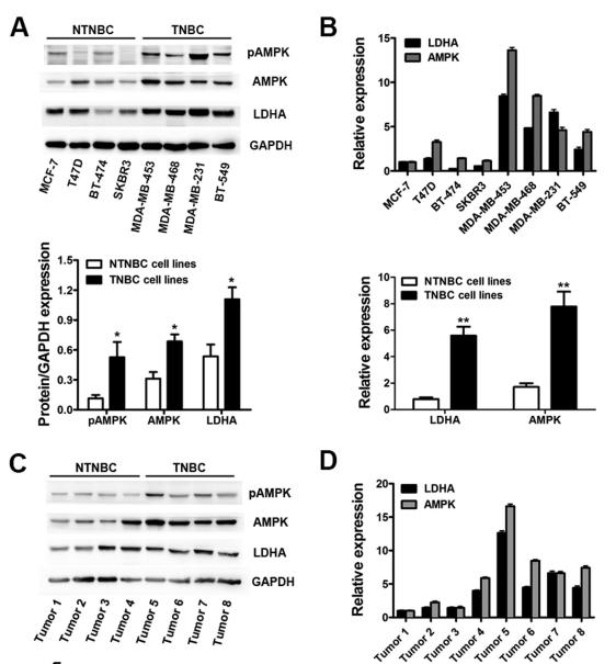 Fig. 1. LDHA and AMPK were up-regulated synchronously in breast cancer. A. Expression levels of LDHA, AMPK and pAMPK were assessed by Western blot (above) and gray image scanning (below) in eight different breast cancer cell lines, including four NTNBC cell lines and four TNBC cell lines. GAPDH was used as a loading control. B. Expression levels of LDHA and AMPK were determined by qRT-PCR (above). The differences between TNBC and NTNBC cell lines were analyzed (below). GAPDH was used as an internal control. C. Expression levels of LDHA, AMPK and pAMPK were assessed by Western blot (above) and gray image scanning (below) in eight different breast cancer tissues, including four NTNBC tissues and four TNBC tissues. GAPDH was used as a loading control. D. Expression levels of LDHA and AMPK were determined by qRT-PCR (above). The diffe...