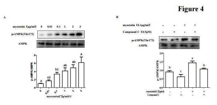 Fig. 4. |Myostatin regulated translation elongation through AMPK.C2C12 myotubes were treated with various concentration recombinant myostatin (0, 0.01,429 0.1, 1, 2, 3 µg/ml) for 48 h andthen lysed and cellular extracts were analyzed by Western blot with 430 anti-AMPK(A)....