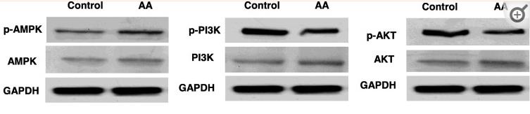 Fig. 5| AA treatment activated the AMPK and inhibited PI3K/AKT signaling pathway. The cells were treated with or without AA (5 μM) for 3 days. aRepresentative western blot of p-AMPK, AMPK, p-PI3K, PI3K, p-AKT, and AKT. GAPDH was served as a loading control....