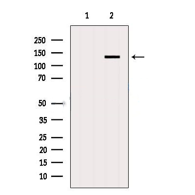 Western blot analysis of extracts from Hela, using AP3B1 Antibody. The lane on the left was treated with blocking peptide....