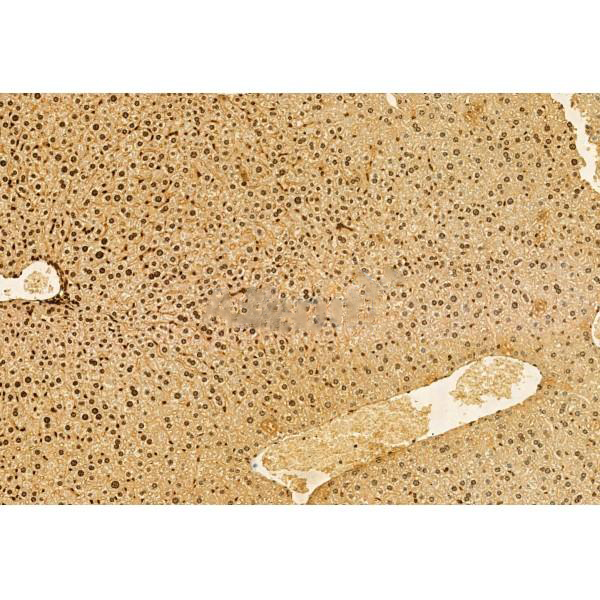 ab12713 at 1/100 staining Mouse liver tissue by IHC-P. The sample was formaldehyde fixed and a heat mediated antigen retrieval step in citrate buffer was performed. The sample was then blocked and incubated with the primary antibody at 4°C overnight. An HRP conjugated anti-Rabbit antibody was used as the secondary antibody....