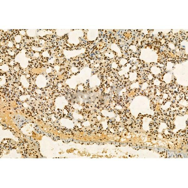 ab12713 at 1/100 staining Rat lung tissue by IHC-P. The sample was formaldehyde fixed and a heat mediated antigen retrieval step in citrate buffer was performed. The sample was then blocked and incubated with the primary antibody at 4°C overnight. An HRP conjugated anti-Rabbit antibody was used as the secondary antibody....