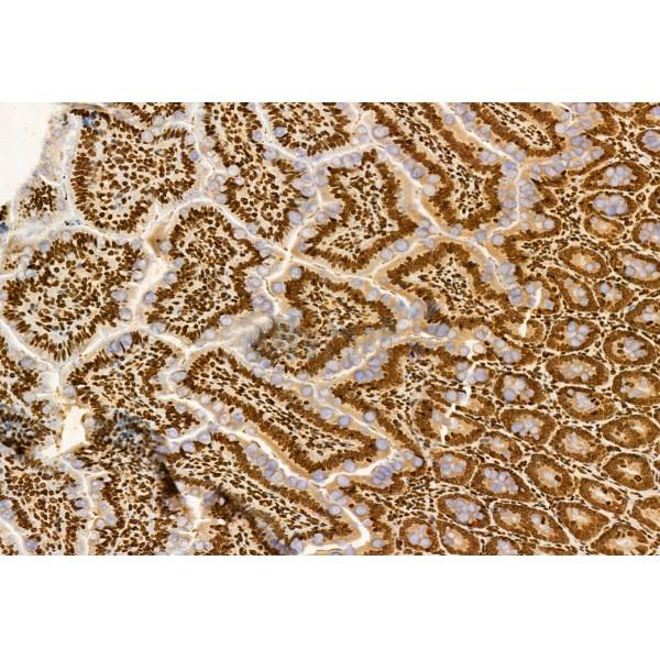 ab12713 at 1/100 staining Rat stomach tissue by IHC-P. The sample was formaldehyde fixed and a heat mediated antigen retrieval step in citrate buffer was performed. The sample was then blocked and incubated with the primary antibody at 4°C overnight. An HRP conjugated anti-Rabbit antibody was used as the secondary antibody....