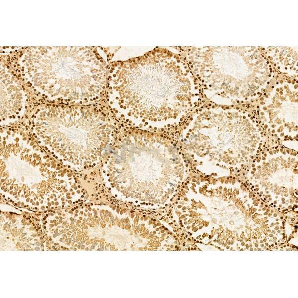 ab12713 at 1/100 staining Rat testis tissue by IHC-P. The sample was formaldehyde fixed and a heat mediated antigen retrieval step in citrate buffer was performed. The sample was then blocked and incubated with the primary antibody at 4°C overnight. An HRP conjugated anti-Rabbit antibody was used as the secondary antibody....