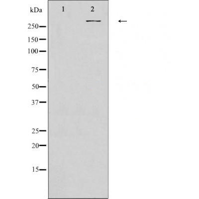 Western blot analysis on HuvEc cell lysates using APC Antibody,The lane on the left was treated with the antigen-specific peptide....
