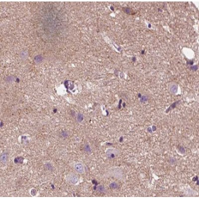 ab10388 at 1/100 staining human brain tissue sections by IHC-P. The tissue was formaldehyde fixed and a heat mediated antigen retrieval step in citrate buffer was performed. The tissue was then blocked and incubated with the antibody for 1.5 hours at 22°C. An HRP conjugated goat anti-rabbit antibody was used as the secondary antibody....