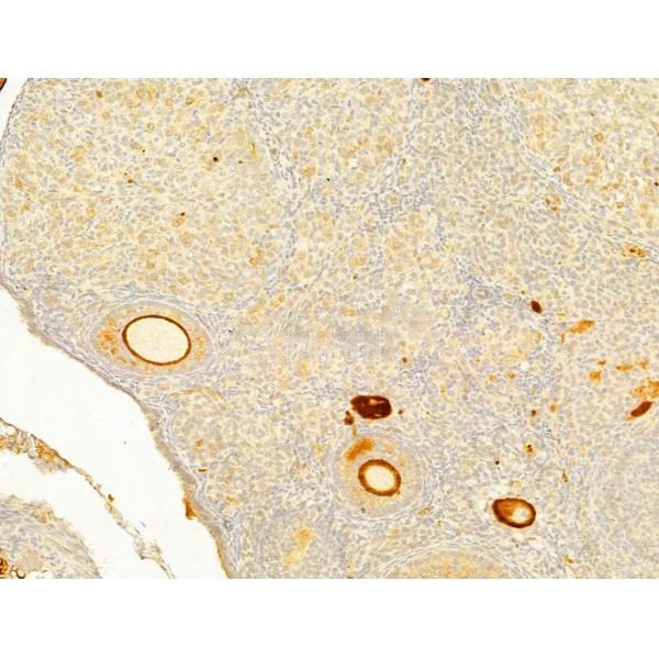 ab10388 at 1/100 staining Mouse ovary tissue by IHC-P. The sample was formaldehyde fixed and a heat mediated antigen retrieval step in citrate buffer was performed. The sample was then blocked and incubated with the primary antibody at 4°C overnight. An HRP conjugated anti-Rabbit antibody was used as the secondary antibody....