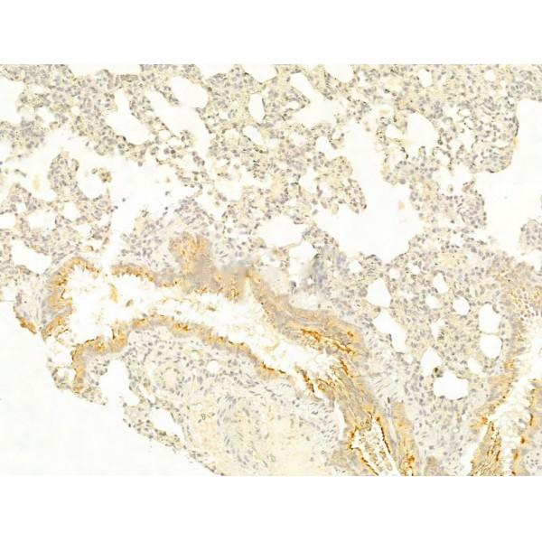ab10388 at 1/100 staining Rat lung tissue by IHC-P. The sample was formaldehyde fixed and a heat mediated antigen retrieval step in citrate buffer was performed. The sample was then blocked and incubated with the primary antibody at 4°C overnight. An HRP conjugated anti-Rabbit antibody was used as the secondary antibody....