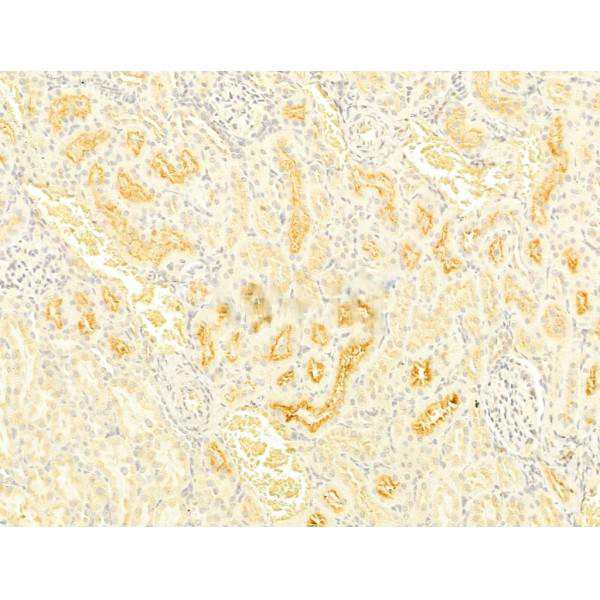 ab10388 at 1/100 staining Rat kidney tissue by IHC-P. The sample was formaldehyde fixed and a heat mediated antigen retrieval step in citrate buffer was performed. The sample was then blocked and incubated with the primary antibody at 4°C overnight. An HRP conjugated anti-Rabbit antibody was used as the secondary antibody....