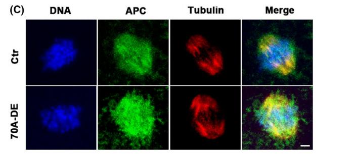 FIGURE 5 Fam70A and Wnt5a regulate adenomatous polyposis coli (APC) level and MT stability. A, Western blot showed that APC protein remarkably increased after Fam70A depletion. B, Quantification of (A). C, Immunofluorescence showed that APC was enriched within spindles and remarkably increased after Fam70A depletion. APC in green, tubulin in red, DNA in blue. D, Western blot showed that Wnt5a was efficiently reduced by siRNA (Table S2). E, Western blot showed that APC remarkably increased after Wnt5a knockdown. F, Quantification of (E). G, RT-PCR showed that APC was efficiently reduced by siRNA (Table S3). H, Fam70A depletion and Wnt5a knockdown both remarkably increased acetylated tubulin level within spindles, while APC knockdown remarkably reduced acetylated tubulin level. Acetylated tubulin in green, DNA in blue. I, Quantification of (H). Scale bar, 5 µm. *P < .05...