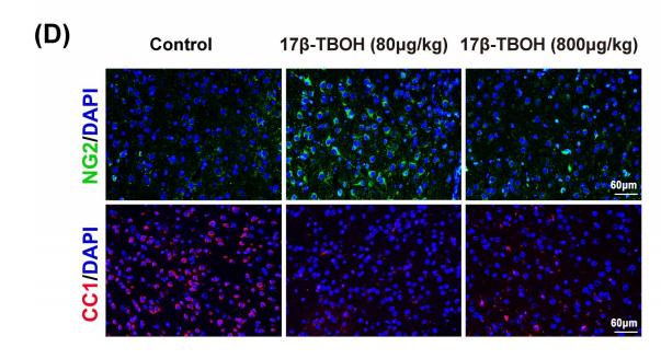 Fig. 5. Effect of 17ββββ-TBOH on the myelination of the mPFC in adolescent mice. (A) Quantitative 893 real-time PCR (qRT-PCR) of myelin gene transcripts in the mPFC (n=4). (B-C) Confocal images and 894 quantification of MBP+ (green) myelinated fibres in the mPFC. DAPI (blue) was used as a nuclear 895 counterstain (n=12 fields from 3 mice per treatment condition). (D-F) Confocal images and 89, quantification of NG2+ (green) cells and CC1+ (red) cells in the mPFC. DAPI (blue) was used as a 897 nuclear counterstain (n=12 fields from 3 mice per treatment condition). Scale bar=60 µm. *p<0.05 **P 898 < 0.01, ***P < 0.001, and ****P < 0.0001 by one-way ANOVA followed by Tukey’s post hoc test. 899 Data are presented as means ± SEM....