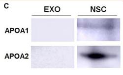 FIGURE 1 | Characterization of exosomes (EXOs). (C) The levels of negative exosomal markers APOA1 and APOA2 in protein lysates of NSC-derived exosome pellets and NSCs were determined by western blotting....
