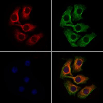 ab17751 staining Hela cells by IF/ICC. The samples were fixed with PFA and permeabilized in 0.1% Triton X-100,then blocked in 10% serum for 45 minutes at 25°C. Samples were then incubated with primary Ab(ab17751 1:200) and mouse anti-beta tubulin for 1 hour at 37°C. An AlexaFluor594 conjugated goat anti-rabbit IgG(H+L) Ab(Red) and an AlexaFluor488 conjugated goat anti-mouse IgG(H+L) Ab(Green) were used as the secondary antibody. The nuclear counter stain is DAPI(blue)....